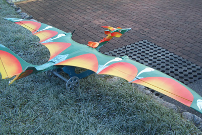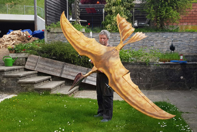 Als ich damals einen CNC-Schnittplan erstellte, der ca. 120 Stunden meiner Zeit in Anspruch nahm, wusste ich nicht, ob er jemals zum Einsatz kommen würde. Doch es kam ganz anders. Nur hatte ich meinen Schnittplan bereits um das 1,5 fache (weitere ca. 80 Std.) auf eine Spannweite von 3012 mm vergrößert und von einem Fliegerfreund fräsen lassen, welcher auch zum Prototyp der 3 m Klasse führte und heute noch gemütlich unter den Wolken seine Kreise zieht. Nach dem Bau und dem ersten Flug war mir klar: "Das ist es" und die 2 m Version flog hypothetisch in den Papierkorb. Den 2 m Pterodactylus habe ich nur noch einmal, nachdem ich den "GROSSEN" Urvogel geflogen hatte, kurz in die Luft bewegt und gleich wieder gelandet. Der Spaß war jetzt nur noch beim 3 m Urvogel. Man muss sich auf eine Sache konzentrieren und diese ständig verbessern und nun bin ich bei der verbesserten Version 3. Bei der V 3.1 ist der Schnabel beweglich. Die Bauzeit (bisher habe ich sechs Flugsaurier gebaut) liegt bei sage und schreibe 560 Baustunden (inkl. Foliendesign), wobei ich für die ersten beiden fast doppelt so viele Baustunden benötigt habe.